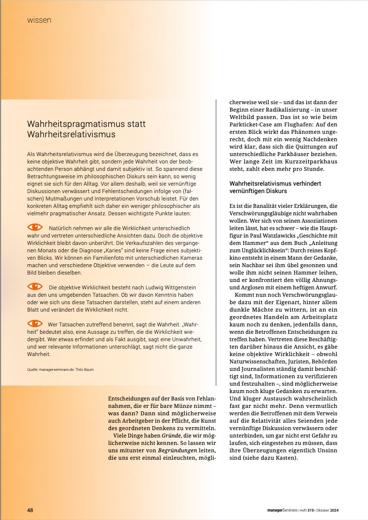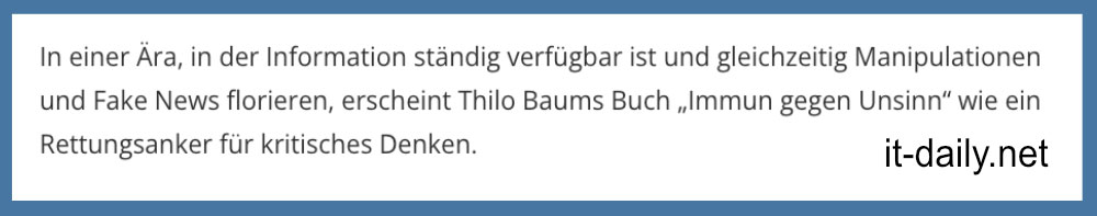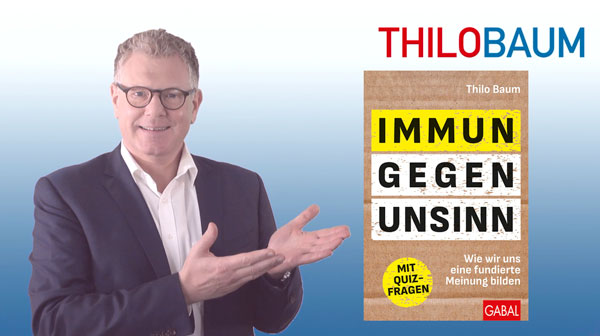 Der Kommunikationstrainer Thilo Baum ist Autor von »Immun gegen Unsinn. Wie wir uns eine fundierte Meinung bilden« (GABAL 2024). Üblich wäre es, dass Thilo Baum sich mit seinem Buchthema »Immun gegen Unsinn« exklusiv als Speaker positioniert. Stattdessen gibt er an andere weiter, damit sie es multiplizieren können. Mach die Ausbildung und komm ins Netzwerk!
