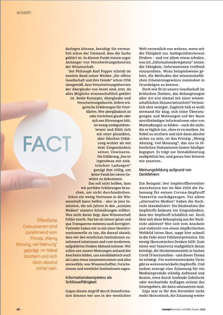 »Informationskompetenz immunisiert gegen Desinformation, Propaganda und manipulative Narrative. Die keimfreien Argumente und die messerscharfe Logik bringen jede Bullshit-Blase zum Platzen.«
